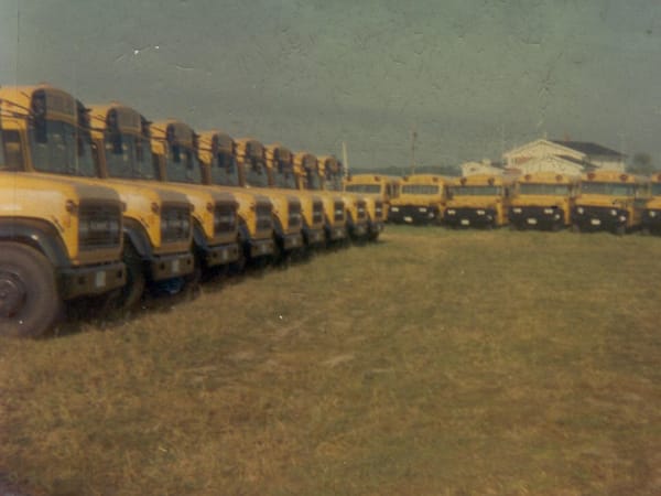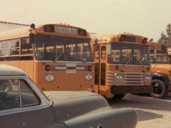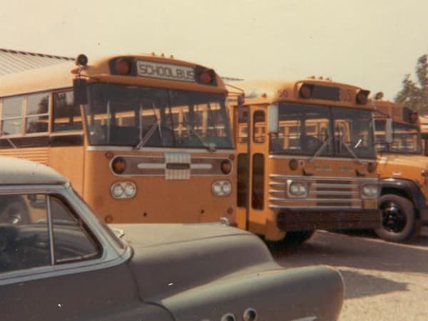 The bus on the left is fleet No. 32. It was a “fancy” school bus used for longer trips before Kobussen purchased motorcoaches.