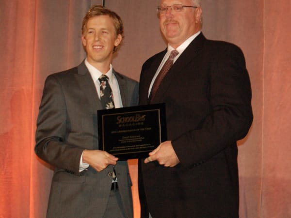 SBF Executive Editor Thomas McMahon (left) presented David Anderson, director of transportation and fleet at Adams 12 Five Star Schools in Thornton, Colo., with the magazine's 2012 Administrator of the Year award.