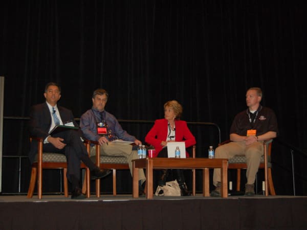 From left: Sunil Mansukhani of The Raben Group, Pete Meslin of Newport-Mesa (Calif.) Unified School District, attorney Peggy Burns of Education Compliance Group, and Bret Brooks of Gray Ram Tactical LLC discussed dealing with student conduct on the school bus.