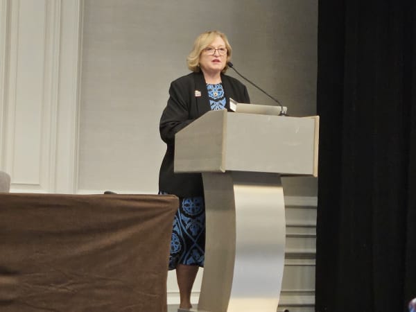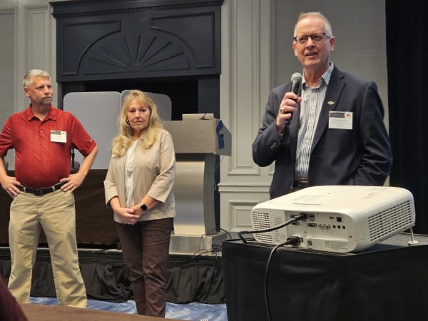 Select conference sponsors shared messages with attendees between sessions. Here, Max Christianson, senior safety advocate for First Light Safety Products, and former Iowa state director, takes the mic before lunch.