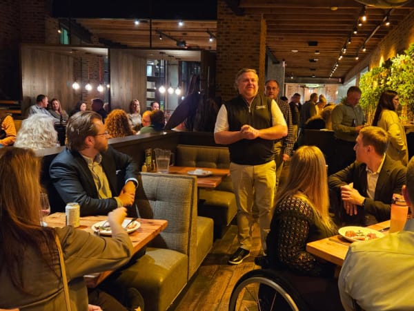 The conference’s second night dinner was held at Matchbox Restaurant and was sponsored by Thomas Built Buses. Here, Chris Foster welcomes attendees.