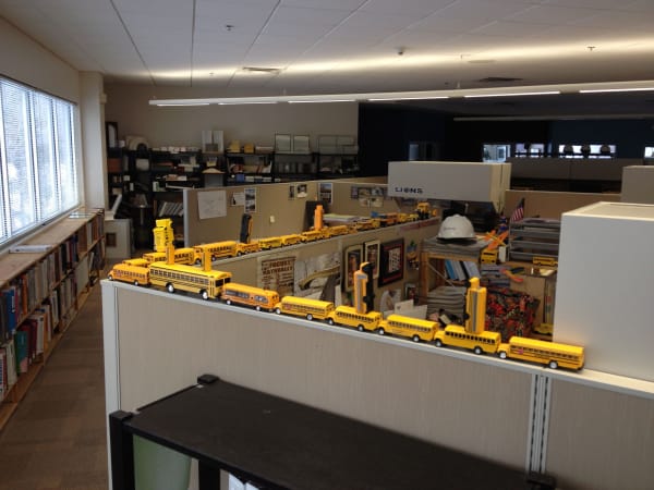 Kristen Bouffard of Tetra Tech Architects and Engineers sent in this photo of school buses in her cubicle at work. "I am an architect and we specialize in K-12 school design. This collection started with a few different co-workers, and now it is all in one place here at my desk. Many people have added buses to it over the years, and we all have fun with it, as you can see. The most recent change was turning it into 'Bushenge' by standing some of them up," she says.