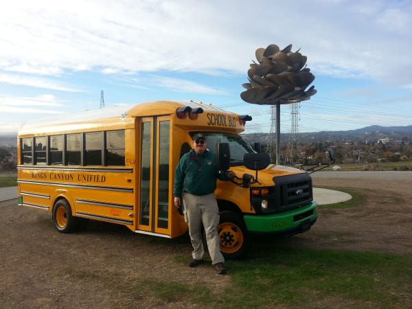 John Clements, who recently retired from Kings Canyon Unified School District in Reedley, Calif., says that of older model school buses, the 1975 Crown Coach that he was assigned in his third year as a school bus driver is his favorite. "Today I have a new favorite," Clements says. "The all-electric Motiv/Trans Tech school bus that I have been privileged to test drive and help bring to the industry. It reminds me of the rocket ride at Disneyland." Clements is pictured here with the bus.
