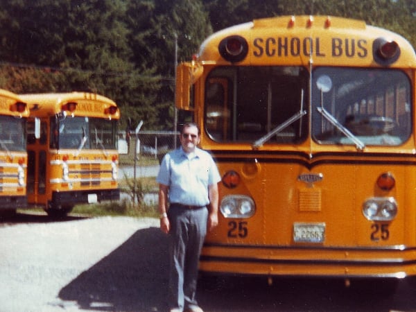 Here, Norman Mars is pictured with a Gillig school bus built in the early 1960s. "This picture was taken during my vacation in July 1980," he says.