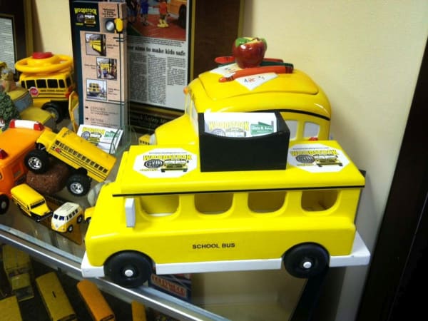 Woodstock Safety Mirror Co. Inc. in Saugerties, N.Y., submitted several photos of its school bus memorabilia collection. The collection comprises more than 70 items, including a Walt Disney school bus lunch box and thermos, four school bus coin banks, a cookie cutter in the shape of a school bus and a school bus cookie jar.