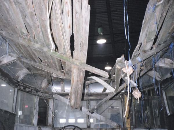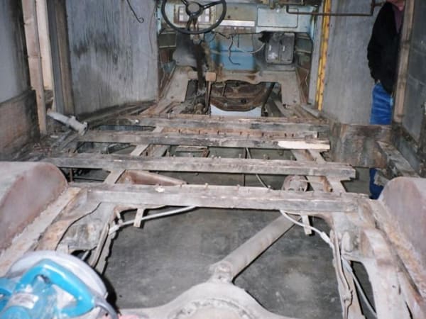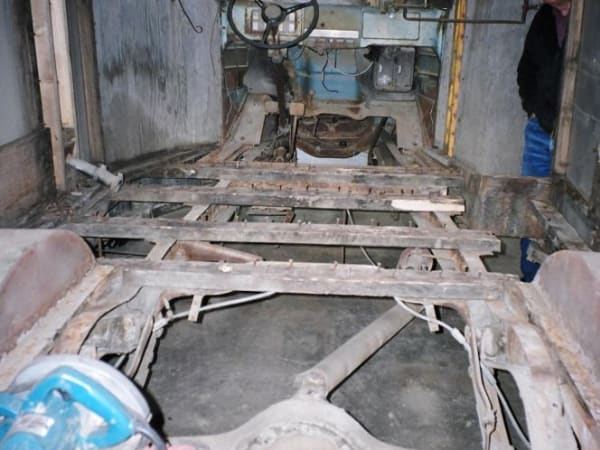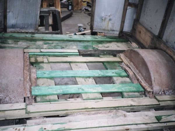 This picture shows the frame and floor supports after the rotted wood had been stripped away. These supports were tested and found to be salvageable. From this point on, the floor could be reconstructed.