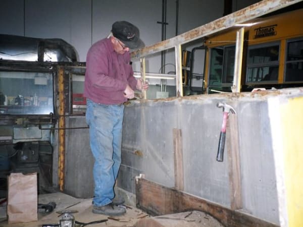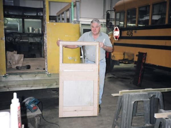Herman Baas shows the inside of the back door of the bus. The original had been stripped down to the skin, and a new frame structure was installed.