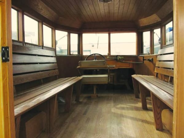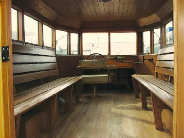 The interior was reconstructed with oak, using paneling and solid materials. For the floor, oak strips were laid, sanded and finished. The benches are solid oak. The dash and gauges were also refurbished.