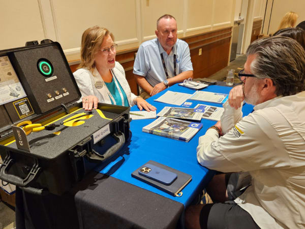 In the vendor/OEM speed networking segment of the event, contractors spent about 10 minutes each with multiple suppliers to learn about new tools and tech available to them. Here, Beacon Mobility meets with Q’Straint.