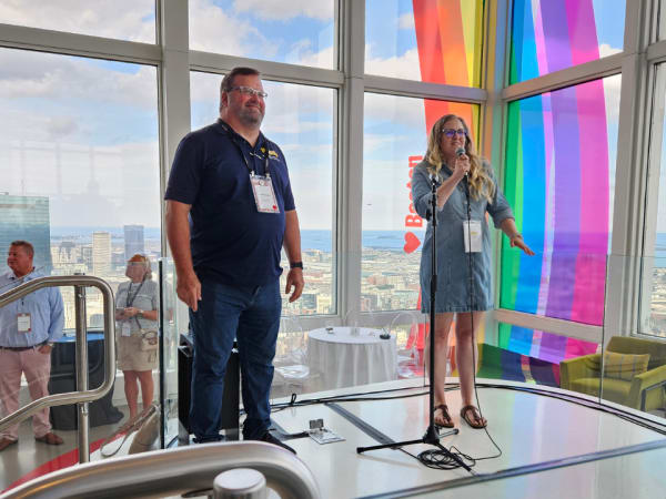 The event’s welcome reception brought attendees to View Boston, offering a 360-degree view of the city atop one of the tallest buildings in New England. Here, NSTA executive director Curt Macysyn and Jenna Van Harpen, representing sponsor Blue Bird, say a few words from the 52nd floor.