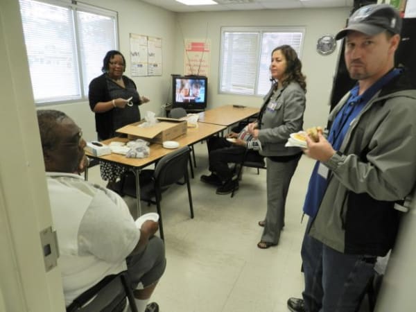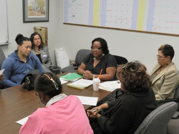 Rike, Beasley and Veronica Norfleet (far right, a transportation supervisor) hold a meeting with a group of new drivers.