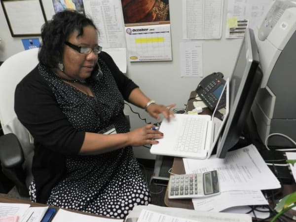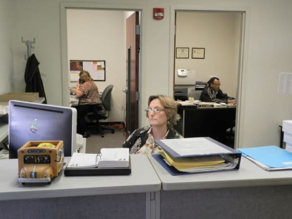 Rike meets with Tonya Foster, one of the district’s routers, to review bus counts and updates to routes.
