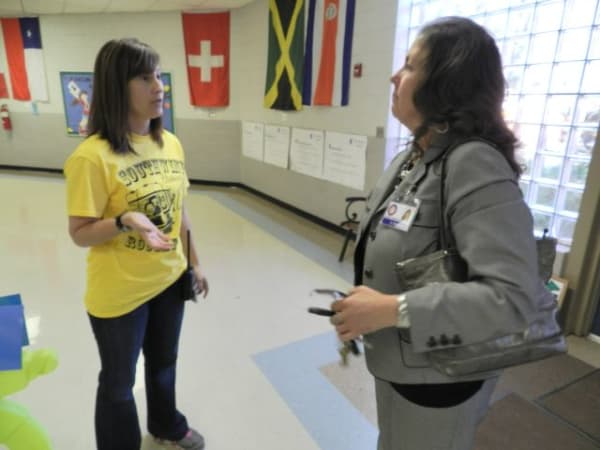Rike talks with Elissa Stratton, assistant principal at Southwind Elementary. Stratton is wearing a T-shirt for the school’s Rough Riders program, in which teachers volunteer their time after school to ride the buses, making sure the kids get in their assigned seats and maintain good behavior.