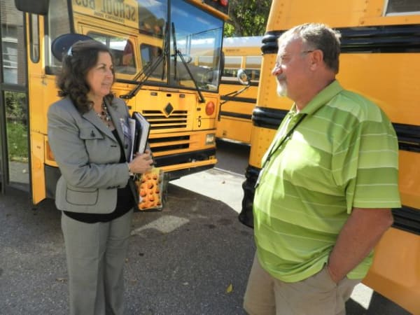 Rike talks with school bus driver Curby White outside of Shadowlawn Middle School.