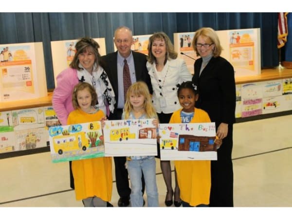 NHTSA Deputy Administrator Ron Medford and FMCSA Administrator Anne Ferro (far right) were among the officials who attended a Love the Bus event at Sunderland (Md.) Elementary School on Feb. 21. They are pictured with Sunderland Principal Kathy Vogel (left) and Calvert County Public Schools board President Rose Crunkleton, as well as three winners of a Love the Bus poster contest.