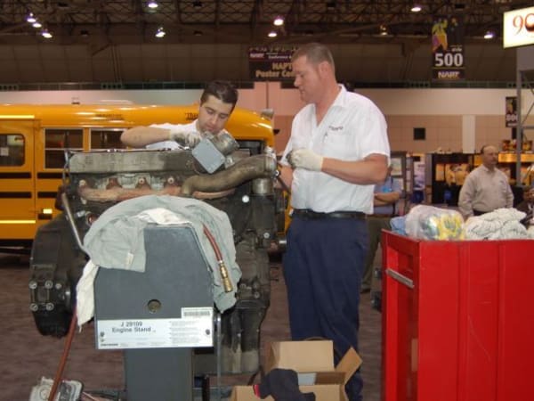 During the trade show, Thomas Built Buses and Detroit Diesel Corp. demonstrated the durability of an MBE 900 engine that had logged 1.6 million miles by taking it apart and showing off its still-viable components.
