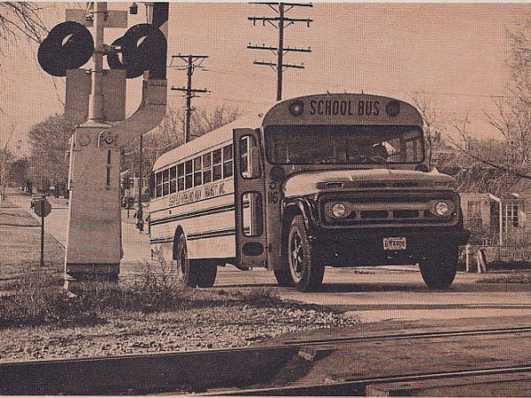 Here, a 1963 Carpenter school bus on a Chevrolet chassis, operated by Deerfield-Highland Park (Ill.) Transit (now Olson Transportation), prepares to cross railroad tracks. The photo was sent by Ray Olson, who now runs the company with his brothers.