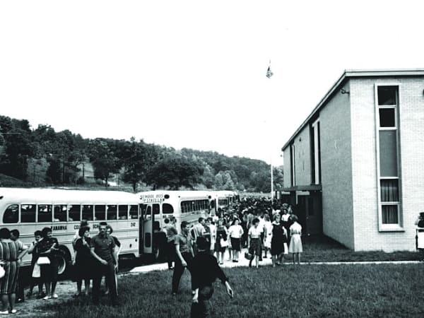 Students arrive for the opening of Herbert Hoover High School in Clendenin, West Virginia, in September 1963. The photo was sent by Brette Fraley, executive director of transportation at Kanawha County (W.Va.) Schools.