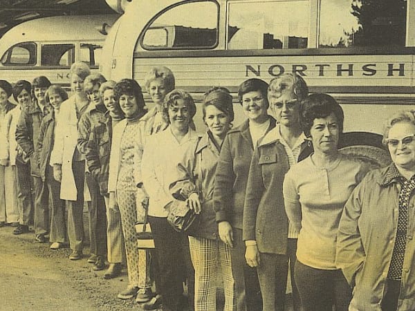 Drivers from Northshore School District in Bothell, Washington, pose for a photo next to Crown school buses in 1974. Transportation Manager Connie Noll notes that the taller woman who is 11th from the right, Carol Crook, is still driving for the district.