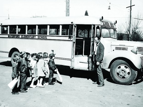 School bus driver Harvell McElroy talks with kindergartners in Waterford, California, in the 1954-55 school year. The photo was submitted by Suzanne Bauer, director of transportation for Waterford Unified School District.