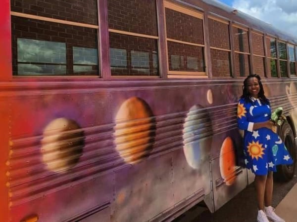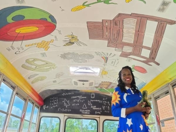 Eighth grade science teacher June Young stands next to the school district's new STEM bus.