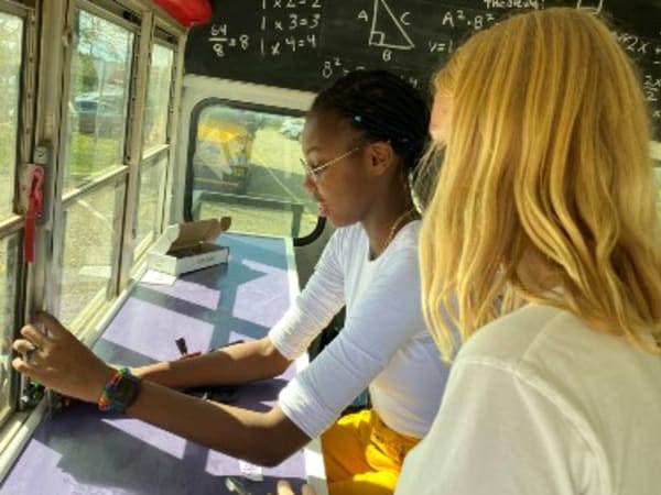 Students draw inside the school district's new STREAM bus.