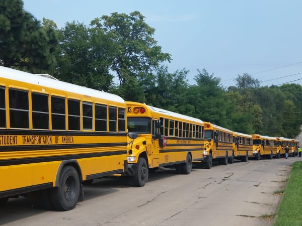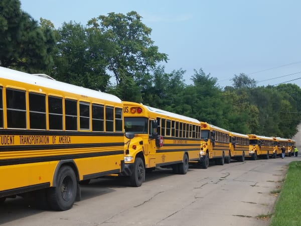 This long lineup of yellow buses is at R.M. Marrs Magnet Center, a middle school in Omaha, Nebraska. The buses are operated by Student Transportation of America’s Omaha location, which transports more than 50,000 students. Photo by Marc Austin.