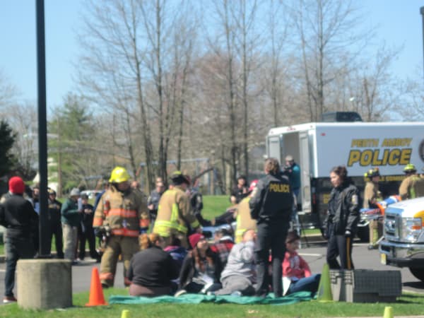 Eighteen students from a local performing arts school participated in the drill, pretending to sustain injuries ranging from broken arms to head wounds.