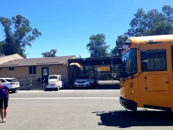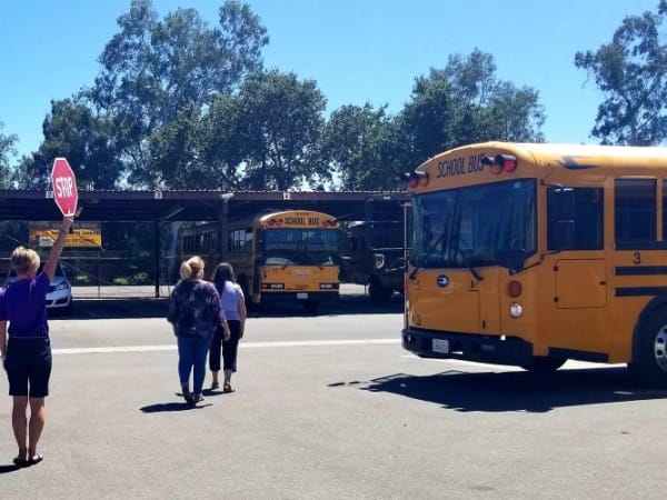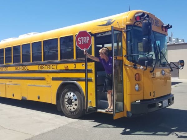 Sabine Konrad, a driver instructor for Visalia Unified School District, demonstrates some key steps designed to boost safety when crossing students in the loading and unloading process used by the state.