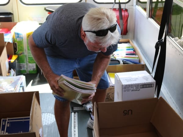 One of the district's buses was filled with a variety of school supplies, such as notebooks, pencils, paper, binders, and backpacks.