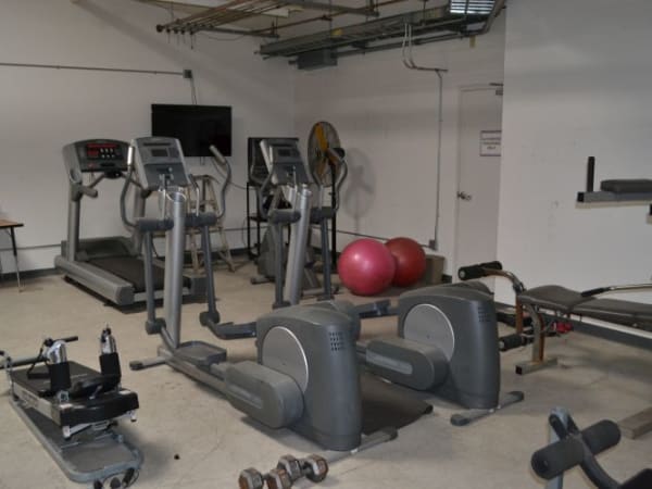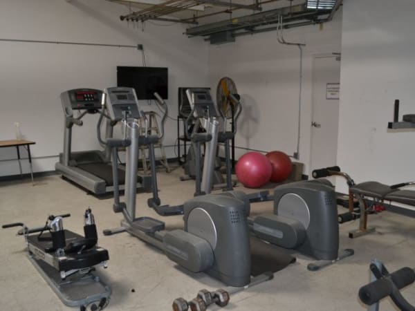 One room of the transportation facility has been turned into a gym, with elliptical machines, a treadmill, weights, and other exercise equipment on hand.