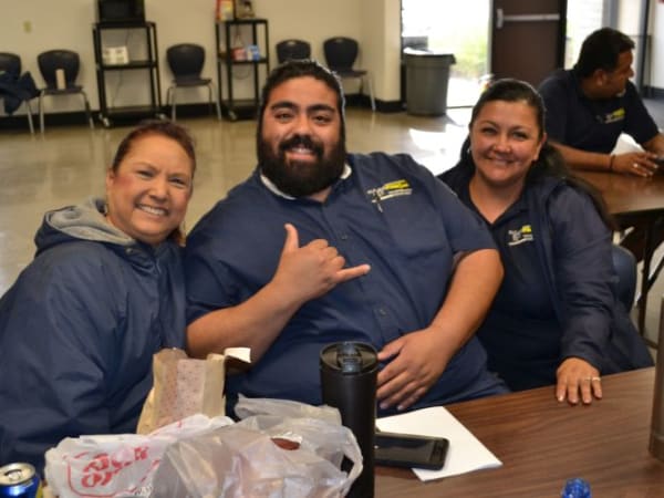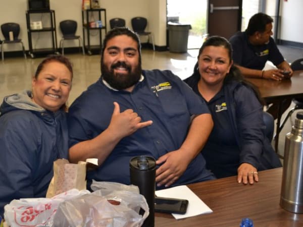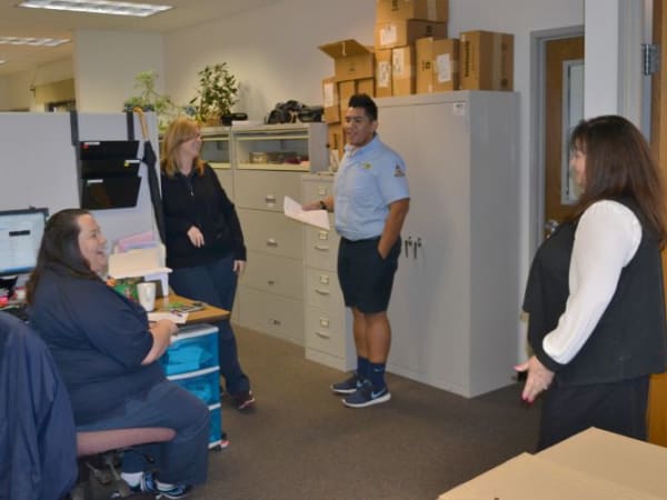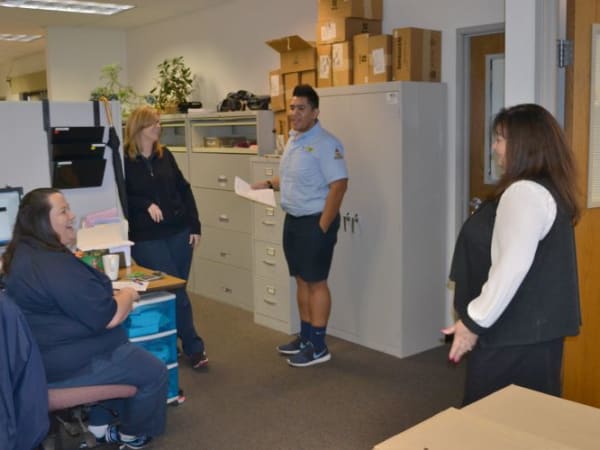 Gayaldo talks with office staff members. She has worked for Elk Grove USD for 10 of her 30 years in pupil transportation.