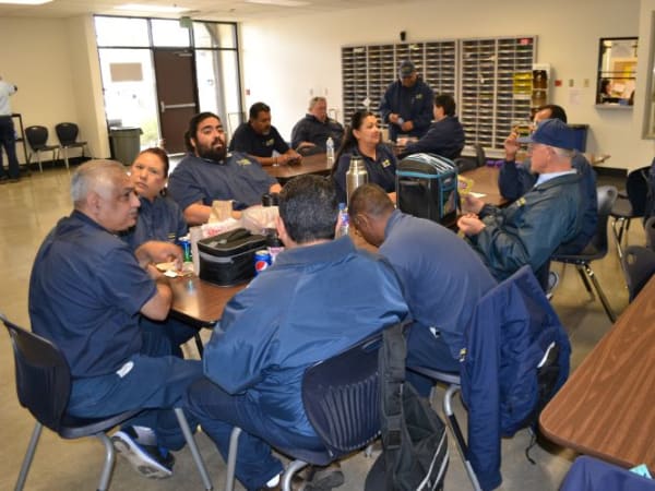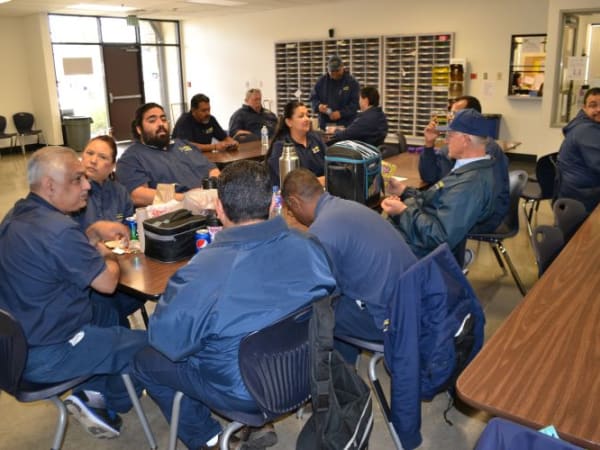 School bus drivers eat lunch and share a few laughs in the lounge.