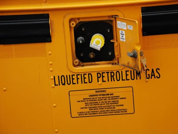 Refueling propane autogas school buses is similar to refueling with gasoline or diesel. The main difference is that the refueling nozzle for propane autogas must be threaded into the tank, which prevents leaks and spillage. Additionally, operators must wear gloves and safety goggles when refueling.