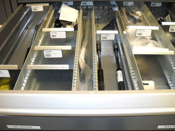 Body parts are grouped together in an assortment of drawers, according to Boling. Gas springs and other seat parts are organized in this drawer. "Each part has its own location designated by what part of the bus it is on and the size of the item," Boling says. "For instance, all engine parts are located in a group of drawers together and then grouped by engine manufacturer."