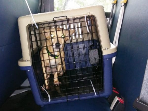 A four-legged passenger is ready to ride to a pet-friendly storm shelter on a St. Lucie school bus.