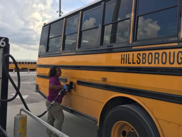 Here, a transportation team member at Tampa-based Hillsborough County Public Schools refuels a bus before Hurricane Irma.
