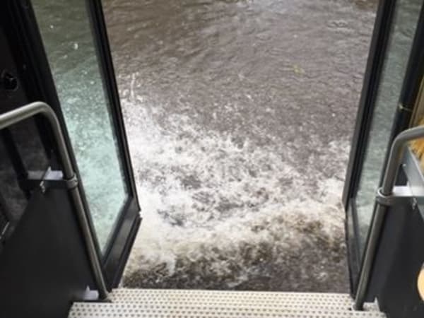 The view through the passenger doorway of a Hillsborough school bus shows flooding from the storm. As Operations Manager Pam Coleman put it, “The best revenge to the massive storm Irma was the joy it gave our department in transporting our community to safety.”