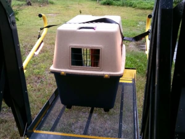The wheelchair lift was used to bring pets in kennels aboard the “yellow ark,” as St. Lucie Director of Transportation Don Carter described it.