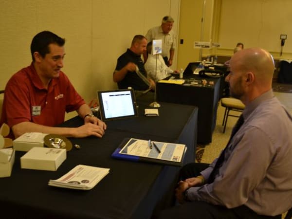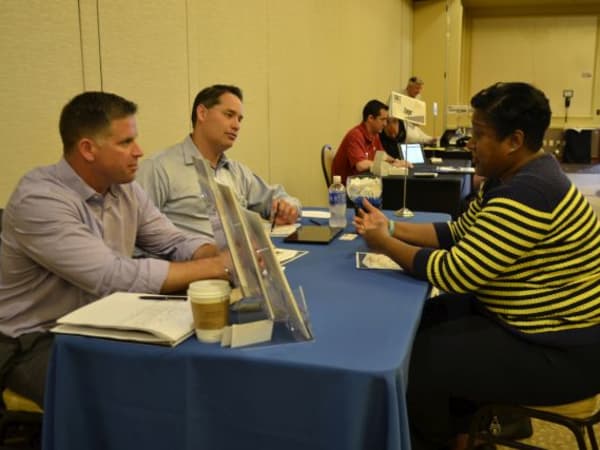 School bus operators were given scheduled times to meet with suppliers. Here, Wanda Paul, chief operating officer of Dallas Independent School District, talks with Zonar’s Craig Kahoun (left), vice president of public markets, and Toby McGraw, senior director of sales.