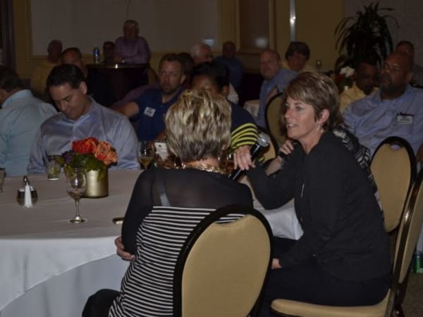 Kim Crabtree (holding microphone), director of transportation at Greater Albany (Ore.) Public Schools, gives input during a session on success stories with data-driven decision making.