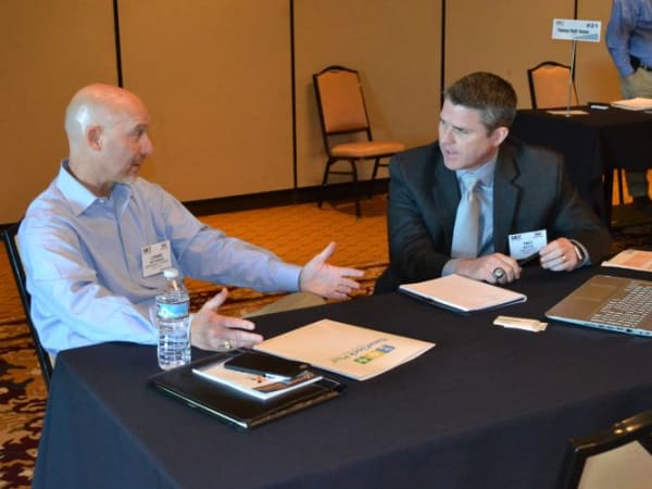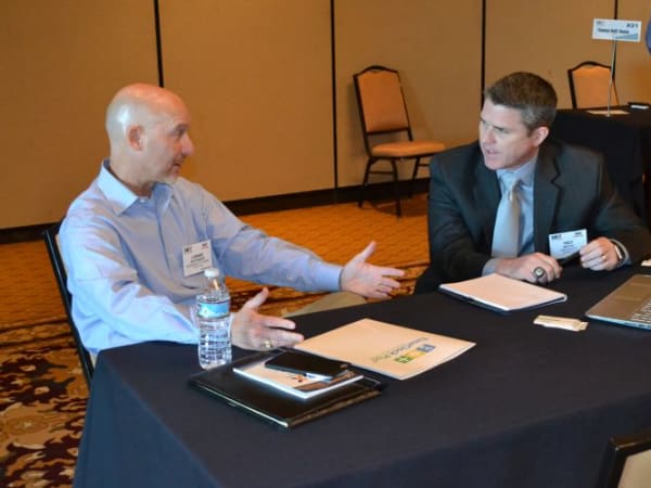 Lon Waterman (left) of North Kansas City (Mo.) Schools talks with Trey Watts of TimeClock Plus.