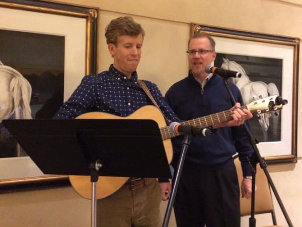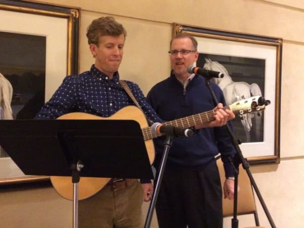 Doug Becker (right) of Frisco (Texas) Independent School District sings John Denver's “Take Me Home, Country Roads” during an SBX evening event. On guitar is SBF’s Thomas McMahon.