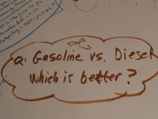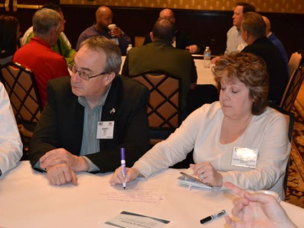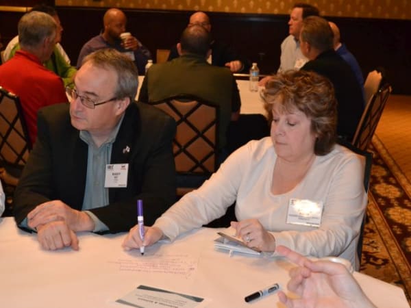During a series of roundtables, SBX attendees deliberated on a range of issues and wrote key points with markers on paper tablecloths. Seen here are Cheryl Fisher from Fauquier County (Va.) Public Schools and Randy Ray from IC Bus.