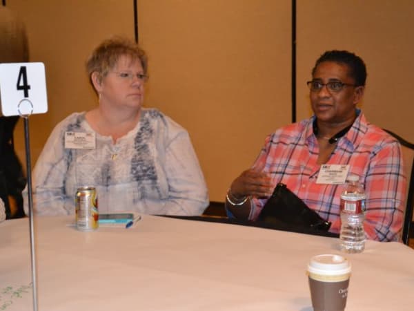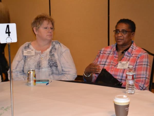 Charmane White (right) of Albemarle County (Va.) Public Schools and Carol Hatfield of Hillsboro (Ore.) School District take part in a discussion on budget and finance issues.