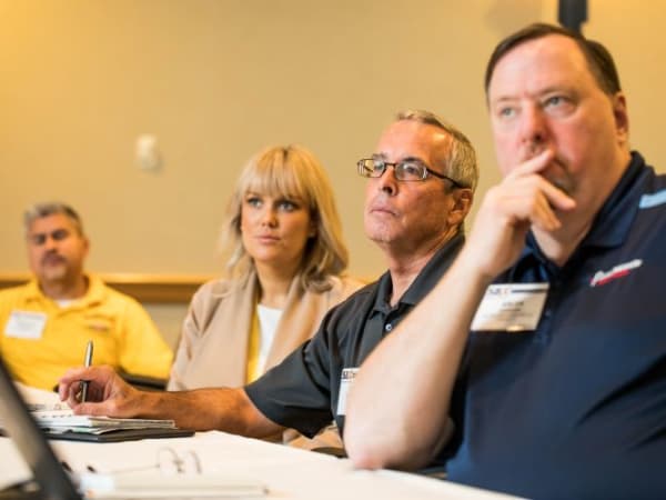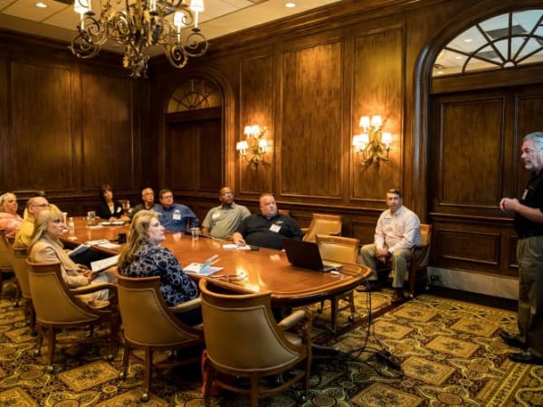 School bus operators listen to a group presentation by Jay Taylor (right) and Matthew Clapp (second from right) of Kidde Technologies.