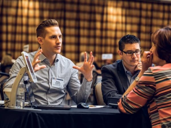 Maureen Heath of Southwestern Ontario Student Transportation Services in Canada talks with representatives of OnCommand Connection in a one-on-one meeting.