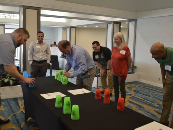 Some attendees also engage in some suspense-building but friendly competition, trying their hand at Sport Stacking. Players have to stack about a dozen specially designed cups in a specific sequence as fast as they can.