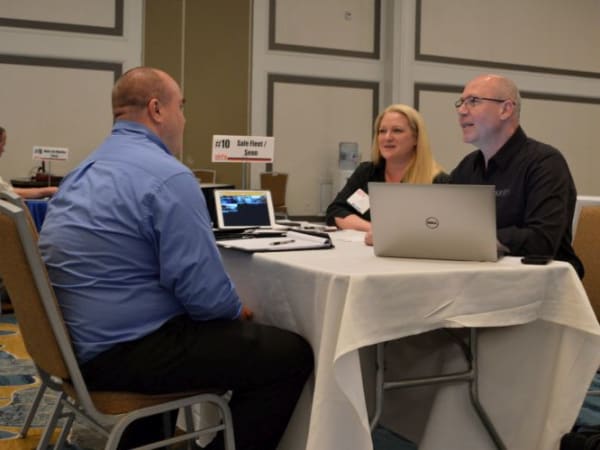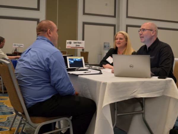 Nick Scott of Salem-Keizer (Ore.) Public Schools (left) has a one-on-one meeting with Bob Burke and Joy Walsh of Safe Fleet/Seon.