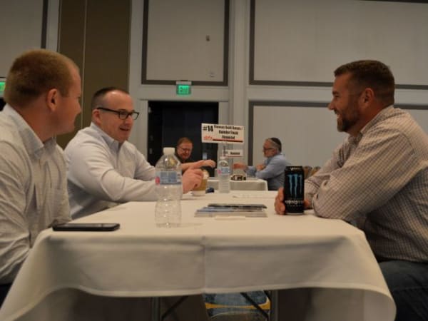 Dave McAvoy (left) and Vance Nofziger of Thomas Built Buses and Daimler Truck Financial talk with Korey Graham (right) of All Aboard America School Transportation in a one-on-one meeting.